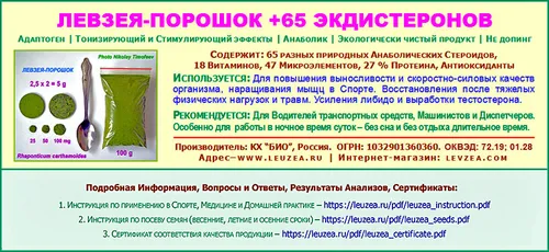 На нашем Интернет-сайте https://levzea.com (Левзея +65 экдистеронов и Серпуха) представлена исключительно продукция растительного происхождения – пищевая продукция из растений-адаптогенов Левзея сафлоровидная и Серпуха венценосная (в форме мелкоизмельченного порошка из листовых и побеговых частей, содержащая безвредное и незапрещенное природное вещество экдистерон), а также сами эти растения в виде семян для посева.